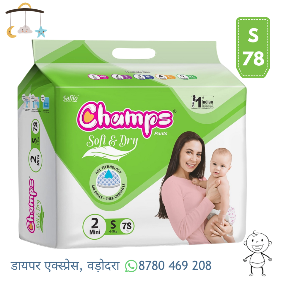 CHAMPS Soft & Dry Pants Style Baby Diaper, Small (S) size, 78 count, 4 to 8 Kg