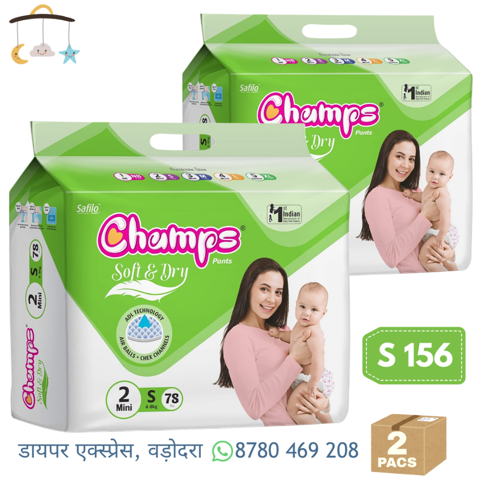 CHAMPS Soft & Dry Pants Style Baby Diaper, Small (S) size, 156 count, 4 to 8 Kg