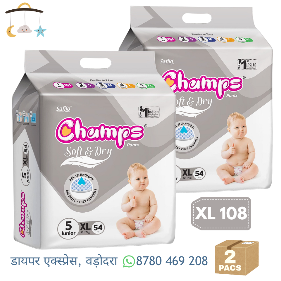 CHAMPS Soft & Dry, Pants Style Diapers, Extra Large (XL) size, 108 Counts, 12 to 17 Kg, 12 Hours