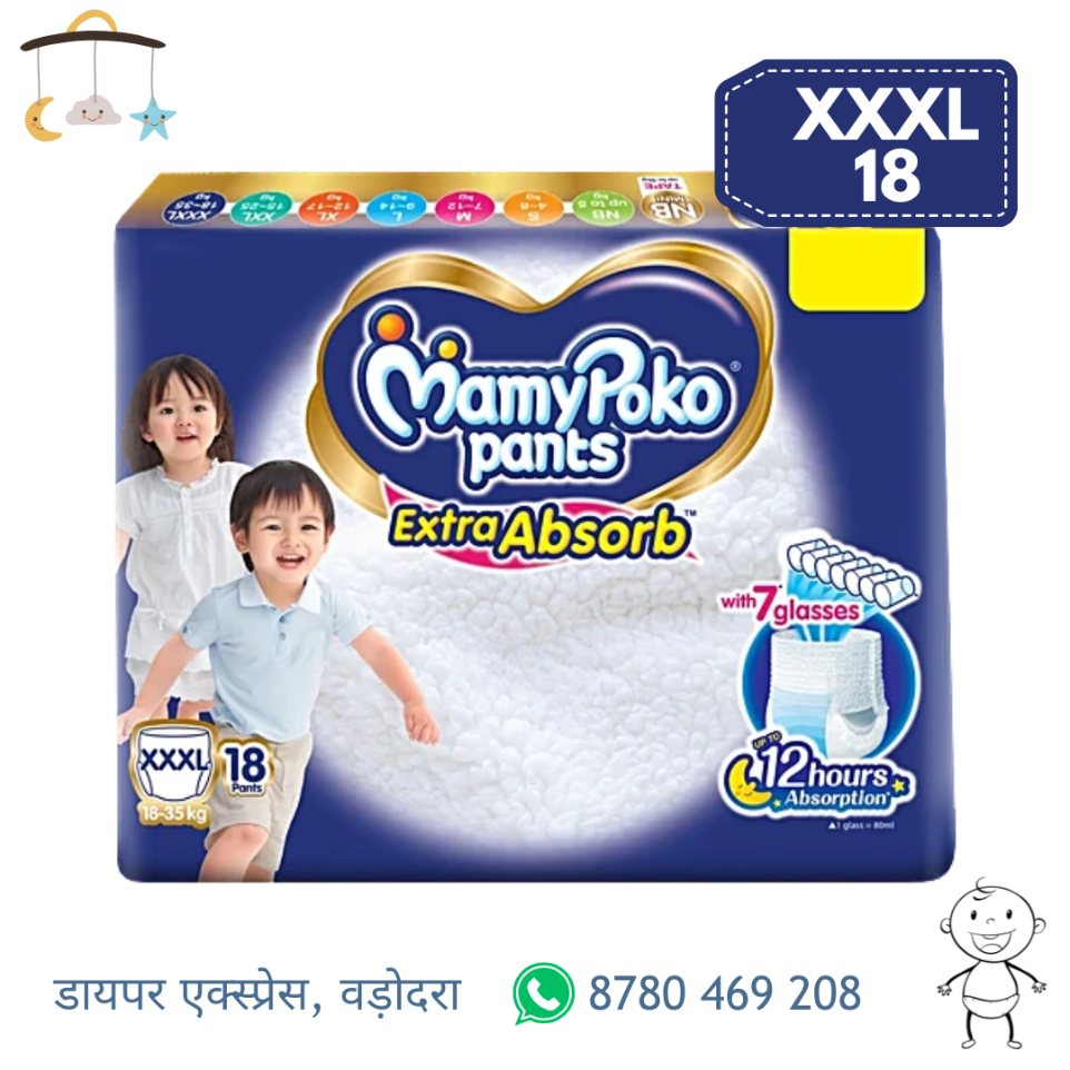 MAMYPOKO Extra Absorb, Pants Style Diapers, Double Extra Large (XXL) size, 48 Counts, 22 to 35 Kg, 12 Hours